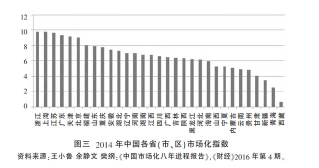 1.提高经济自由度2015年,美国华府智库传统基金会发布了《2015年经济自由度报告》,中国得分52.7分(全球平均得分为60.4分),在亚太42个国家和地区中排第30位;在参与排名的178个经济体中列第139位,仍属不太自由的经济体。经济自由度得分最高组国家,也拥有最高的人均收入水平;随后逐步递减,减至最低得分组,人均收入水平也最低。就国内而言,以市场化指数衡量经济自由度,区域之间的差异较为明显(见图三),尤其是中西部地区,应通过加强产权保护和减少规制来提高经济自由度。提高经济自由度的过程,也是政府调控方式由行政手段向法律手段和经济手段转变的过程。
