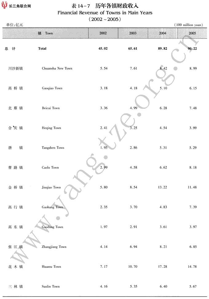 历年各镇财政收入(2002~2005)
