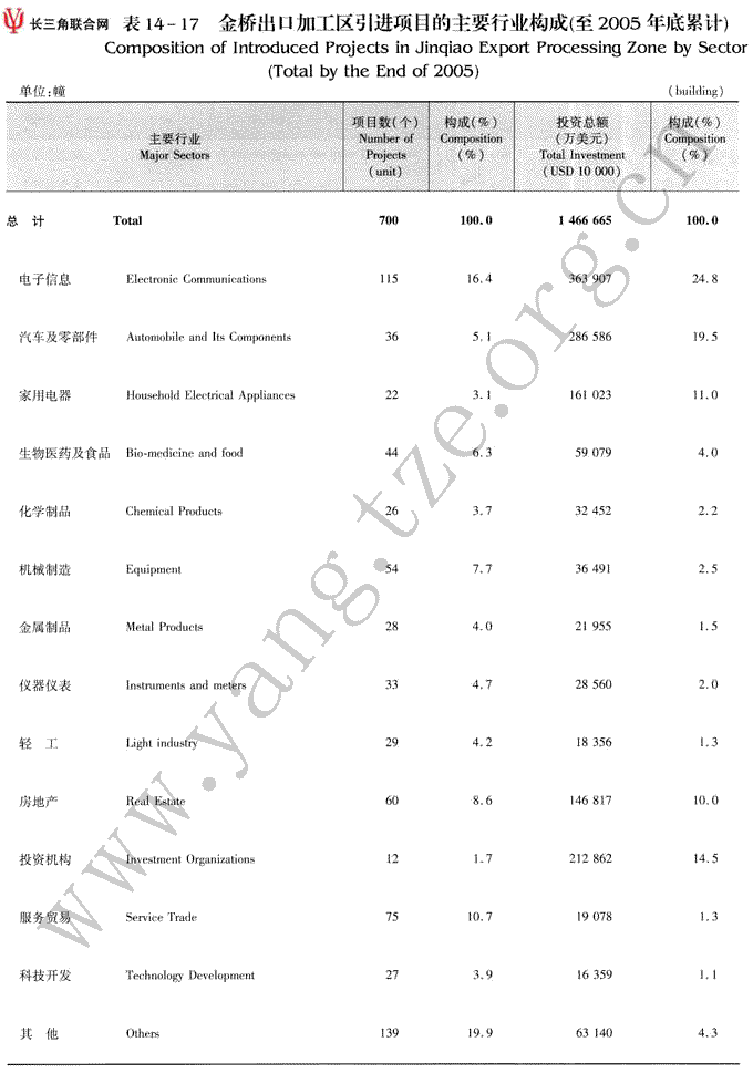 金桥出口加工区引进项目的主要行业构成(至2005年底累计)