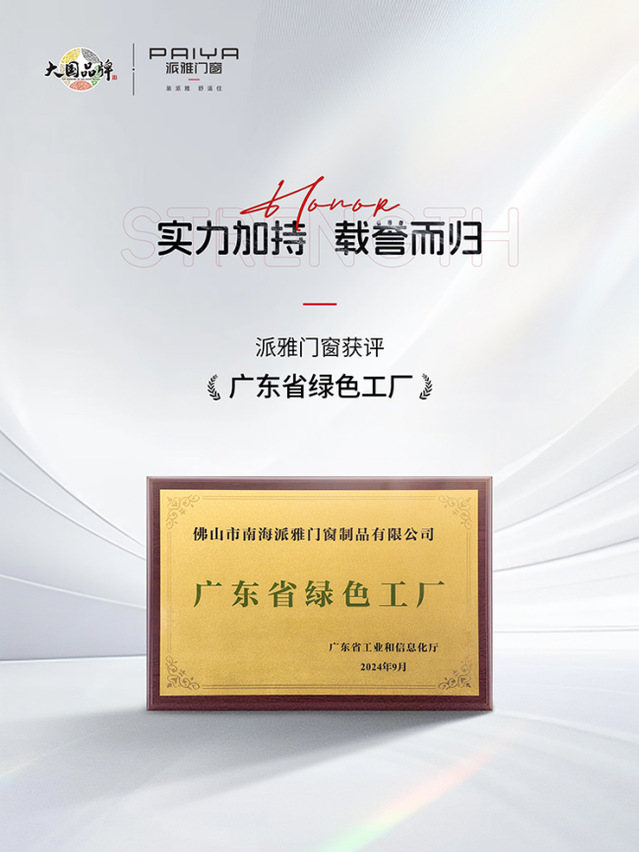 作为引领门窗行业高质量发展的代表品牌,大国品牌派雅门窗于近日获评「广东省绿色工厂」,为行业树立绿色低碳新标杆。