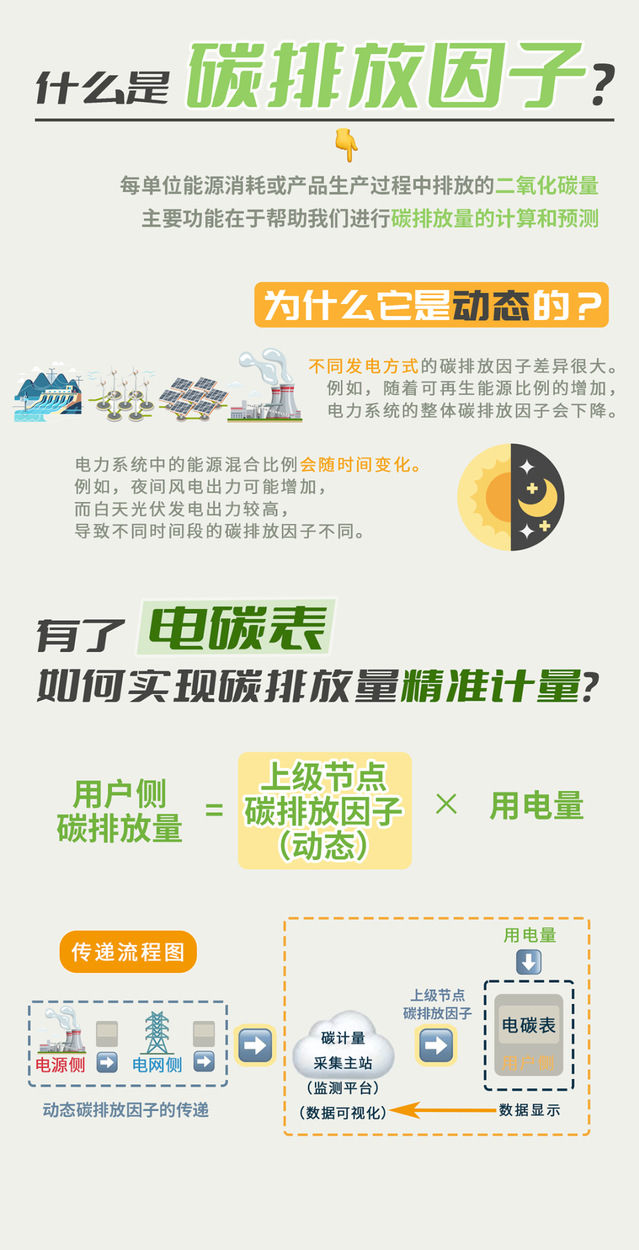 根据当前电网中各类电源的供给比例(如火电、风电、光伏发电等),系统会实时更新“生产—运输—消费”全链条的“碳排放因子”,即每度电对应的碳排放量。