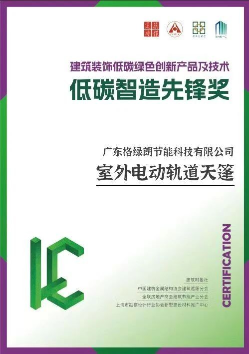 近日,第二届低碳装饰生态圈联合年会在上海虹桥·国家会展中心成功举办。广东格绿朗节能科技有限公司凭借其核心产品“室外电动轨道天篷”,在众多参评产品中脱颖而出,荣获“建筑装饰低碳绿色创新产品及技术-低碳智造先锋奖”。这一荣誉不仅是对格绿朗技术实力的高度认可,更是对其坚持低碳绿色发展的价值背书,展现了格绿朗在推动建筑装饰行业绿色转型方面的卓越成就。
