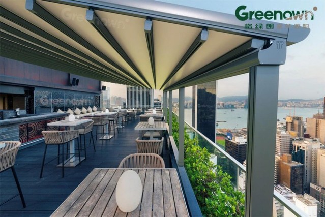 格绿朗率先引进全新一代PERGOLA室外遮阳技术,采用高强度铝合金骨架与顶级PVDF面料复合工艺,打造出更大覆盖面积、更高稳固安全的折叠遮阳篷。其外飘伸展可达到24米(中间无立柱情况下),抗风性能达10级以上,通过调节多种功能模式,实现晴天遮阳、雨天避雨、清风纳凉、夜灯氛围等多场景全天候智能守护。