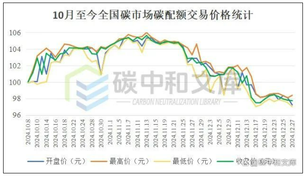 时隔近5个月——9月24日,碳价再次破百,最高价是11月13日的106.2元/吨。时间进入到10月,碳价基本保持在100元/吨以上,但12月中下旬碳配额的交易价格出现了下跌。截至到12月27日,2024年全国碳市场完成的碳配额交易量为1.88亿吨,而全国碳市场自2021年上线以来累计碳配额交易量约为6.3亿吨。