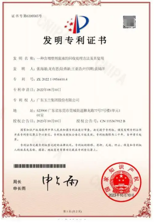 在固废治理领域,玉兰集团以技术突破实现资源循环。其自主研发的专利技术(专利号:ZL202210954410.4)成功回收40余吨DINP废液,转化为可复用的生产原料,年节省成本超百万元。