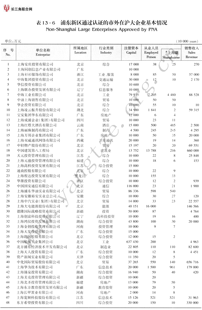 浦东新区通过认证的市外在沪大企业基本情况