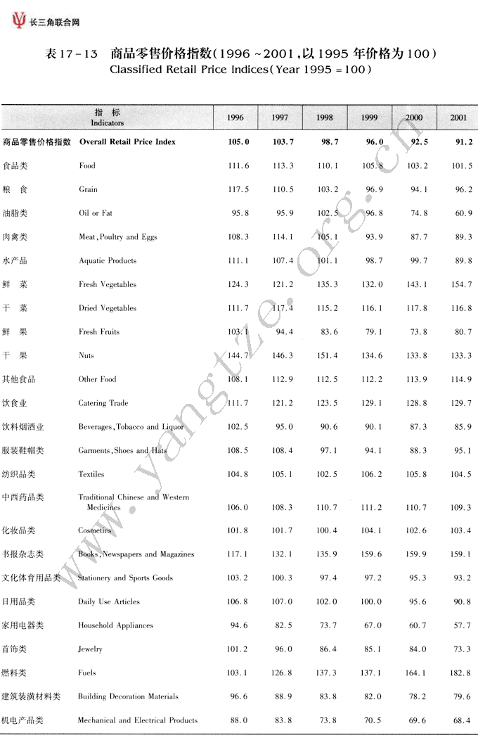 商品零售价格指数(1996-2001年,以1995年价格为100)