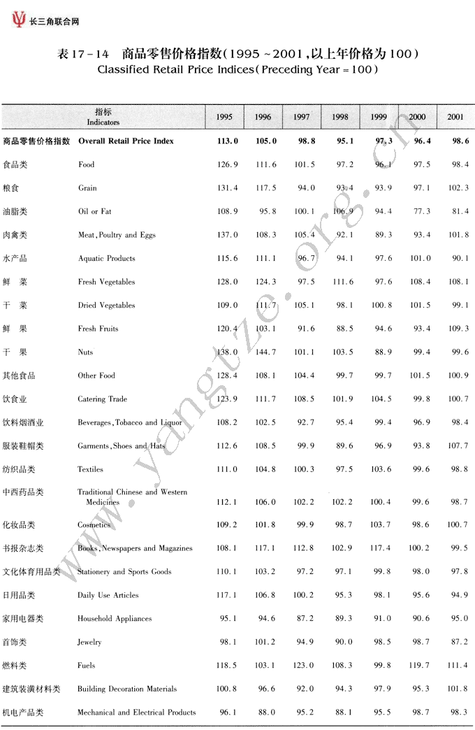 商品零售价格指数(1995-2001年 以上年价格为100)