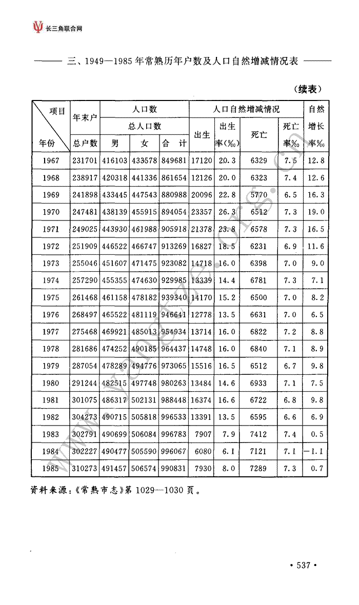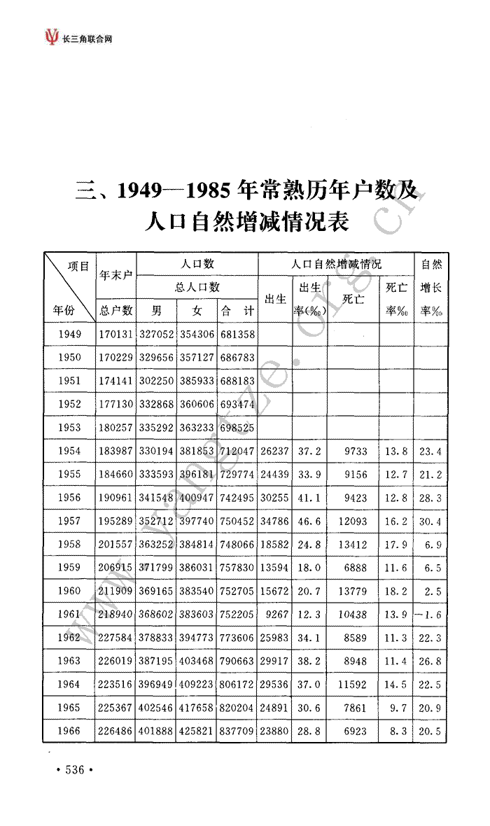 三、1949-1985年常熟历年户数及人口自然增减情况表