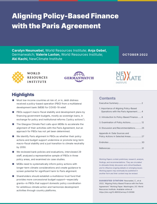 尽管银行做出了气候承诺,但尚未公布如何使这种贷款与《巴黎协定》保持一致的方法。目前的做法并不能阻止破坏各国到2050年向全球碳中和的公正过渡。然而,考虑到商定的政策行动可能对影响排放模式和易受气候变化影响的政策和体制环境产生重大影响,这一点迫在眉睫。