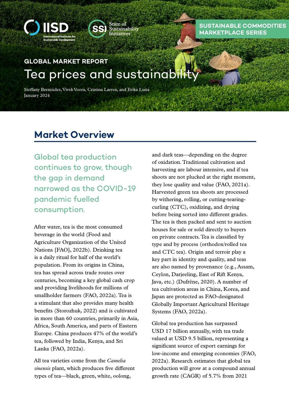 本报告探讨了茶叶行业的最新市场趋势,并解释了为什么可持续性标准和其他价值链参与者需要更好地认识到茶叶生产的社会和环境成本。