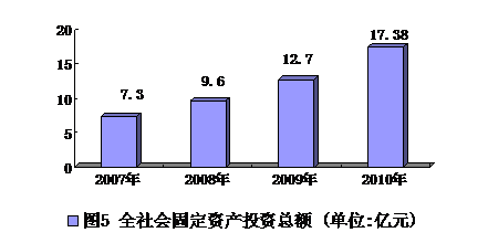 完成全社会固定资产投资从2007年的7.3亿元,增加到2010年的17.38亿元,年均增长24.22%。