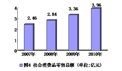 全区社会消费品零售总额从2007年的2.46亿元,增加到2010年的3.96亿元,年均增长12.64%。