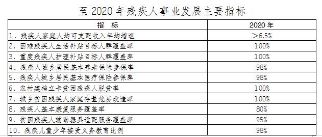 到2020年,残疾人事业法规政策体系更加完善,残疾人权益保障制度和基本公共服务体系更加健全,残疾人融入和参与社会更加广泛,残疾人事业与我市经济社会协调发展;残疾人脱贫攻坚任务顺利完成,残疾人社会保障和基本公共服务水平大幅提高,残疾人群体幸福感、获得感明显增强,共享全面建成小康社会的成果。
