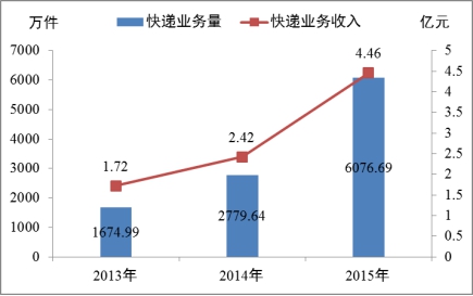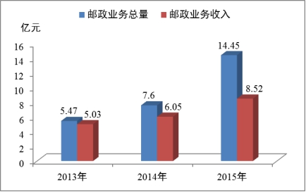 业务规模总体持续增长。“十二五”期间,宿迁市邮政行业业务总量和业务收入均呈现持续增长态势。2015年,宿迁市全年邮政行业业务总量完成14.45亿元,同比增长90.13%;全年业务收入(不包括邮政储蓄银行直接营业收入)完成8.52亿元,同比增长41.29%。其中,快递服务发展尤其迅速。2015年全市快递实际发生业务量6077万件,同比增长118.61%;快递业务收入完成4.46亿元,同比增长84.30%。普遍服务业务呈现总体下滑趋势。2015年全市函件业务量完成240.43万件,同比下降58.70%;包裹业务量完成7.43万件,同比下降1.07%;订销报纸业务完成4646.96万份,同比下降3.53%;订销杂志业务完成203.07万份,同比下降0.47%;汇兑业务完成34.97万笔,同比下降28.07%。普遍服务业务的萎缩正是当前电商、快递产业迅猛发展背景下的必然结果,在正确对待的同时应探寻新的业务发展模式。