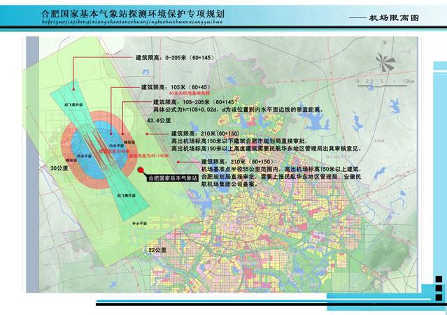 第十六条 合肥国家基本气象站泛保护区范围控制:针对观测场日出62°~118°、日落242°~298°方向障碍物最高点相对高程大于136.8米,可能对本观测场造成影响的建构筑物、高大树木。规划建设等部门在审批该区域的建筑物、构筑物时应充分考虑气象探测环境的保护,建设障碍物的高度和距离等均应满足《气象设施和气象探测环境保护条例》的保护标准,对有影响的建设项目不予批准。