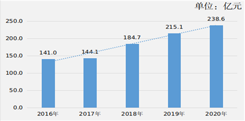 商品销售总额: 2016年141.0亿;2017年144.1亿元; 2018年184.7亿元;2019年215.1亿元;2020年238.6亿元。