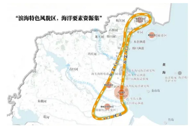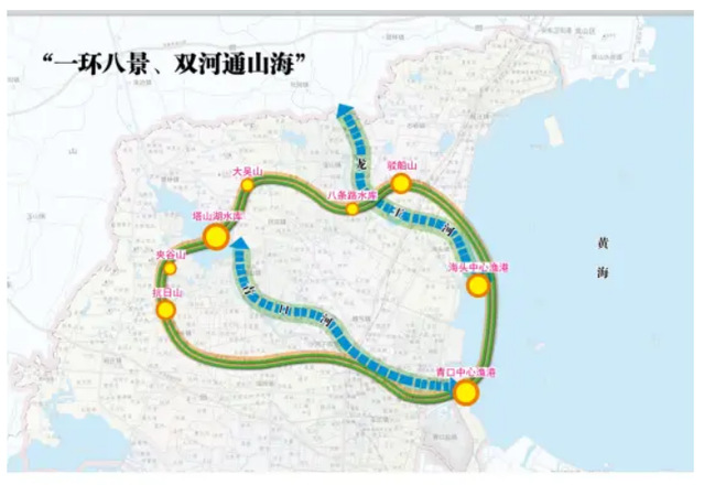 山海联动发展,助推乡村振兴。围绕青口河、龙王河构建滨河生态景观环线,串联夹谷山、抗日山、大吴山、驳船山、塔山湖水库、八条路水库、海头中心渔港、青口中心渔港等旅游要素资源,构建“一环连八景、双河通山海”的绿色生态共同体,打通通山达海大动脉,实现生态保护和人文亲海联动发展、共同进步,带动沿线乡村快速发展。