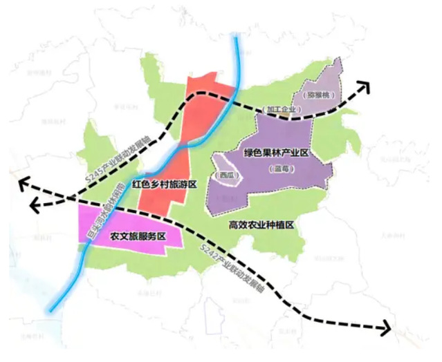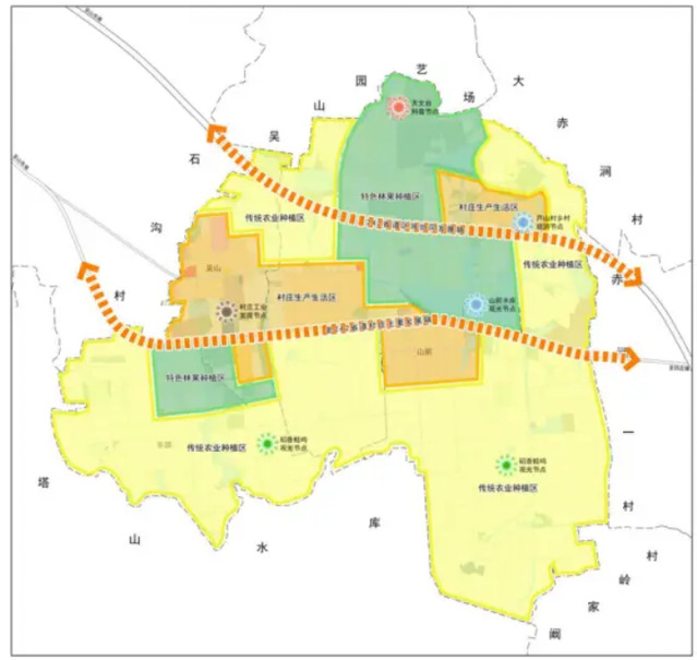 立足生态之本,着力三生融合,实现三产联动。规划将第一产业进行提档升级,发展特色蓝莓种植和传统小麦种植;依托特色林果种植产业,发展农产品初加工,对产品进行包装、分拣、销售,促进村集体经济向高端化、产业化迈进;利用自身生态资源的优良基础和紧邻大吴山旅游核心的区位优势,发展乡村观光旅游业。