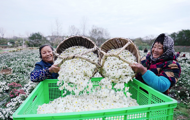 滁菊种植和加工还带动了村民在家门口实现就业。采收期,村民们采摘鲜花每月可收入3000元,还可以到车间上班“拿工资”。这让不少村民感叹:“滁菊变成‘致富花’,日子越过越有奔头了!”