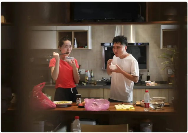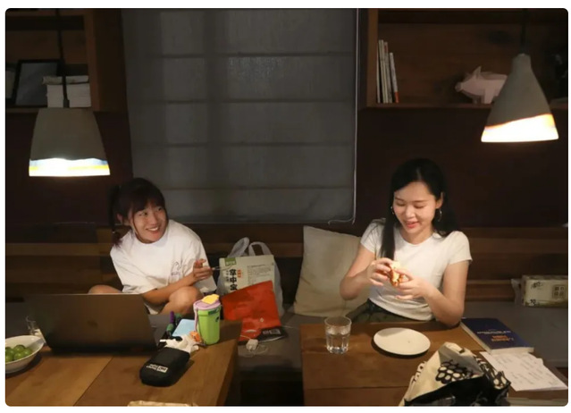 七八十平方米的社区共享大厅,工作区、生活区、休闲区并没有严格的区分。有的人吃着汉堡开启电脑工作,有的人哼着小曲制作早餐,有的人喝着咖啡逗着小猫。