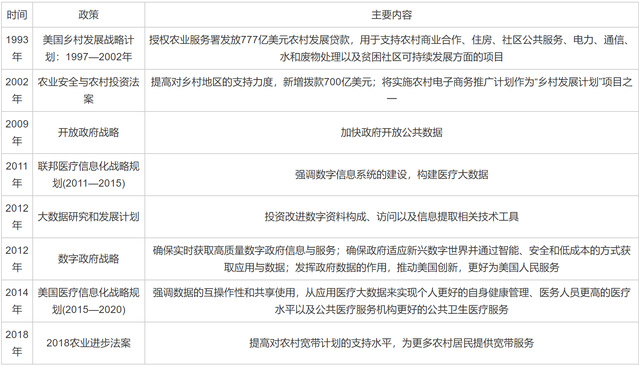 美国正积极推进政策数字化转型,陆续出台了《开放创新备忘录》《数字政府:建立一个面向21世纪的平台更好地服务美国人民》等法规战略,加速推动数字政府的建设。2012年发布的《大数据研究和发展计划》,更是提出将大数据技术作为提升政府治理能力的重要手段。乡村治理作为国家治理的一部分,其数字化进程也受到这些政策的大力推动。以公共教育和医疗服务为代表的社会公共服务信息化建设战略规划,也从乡村公共服务数字化角度推动乡村治理数字化发展。此外,自1936年《农村电气化法》出台后,美国陆续颁布一系列农业农村规划法案,从农村基础设施建设、金融信贷、生产生活服务等方面对乡村治理数字化提出发展要求及建设方向。