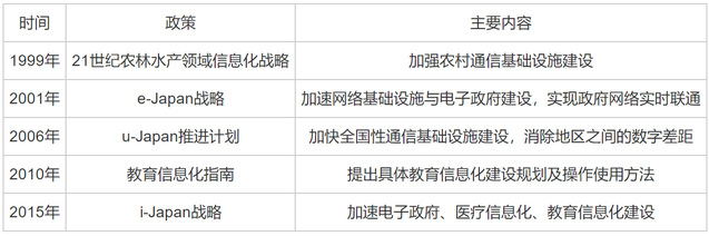20世纪末,日本开始重视数字化建设,通过出台《21世纪农林水产领域信息化战略》,大力开展农村通信基础设施建设,着力扭转日本农村与大城市在社会数字化方面的巨大差异。此后日本陆续围绕信息基础设施、信息技术、远程医疗等方面制定了e-Japan战略、u-Japan推进计划、i-Japan战略等一系列数字化建设战略(见表3)。这些数字化建设战略的实施加速了日本社会数字化进程,带动乡村治理数字化发展。