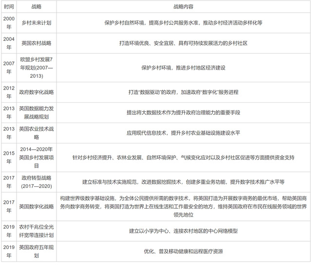 目前,数字化治理已经成为英国数字化发展的重要领域,自2012年首次提出打造“数字驱动”政府,英国就在数据能力发展、政府数字化转型、农业信息技术应用、乡村发展等层面,陆续制定并出台了相关国家战略规划(见表5)。这些战略规划的出台从数字政府、数字农业、数字乡村等多元角度推动了英国整体数字化治理发展。目前英国已建成“以人为本、高度灵活、高度包容”的数字化政府,乡村治理范围也从环境治理拓展到自然与人文环境治理相结合[38]。
