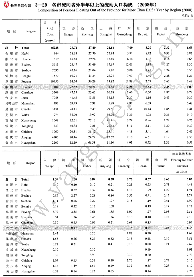 各市流向省外半年以上流动人口构成(2008年)