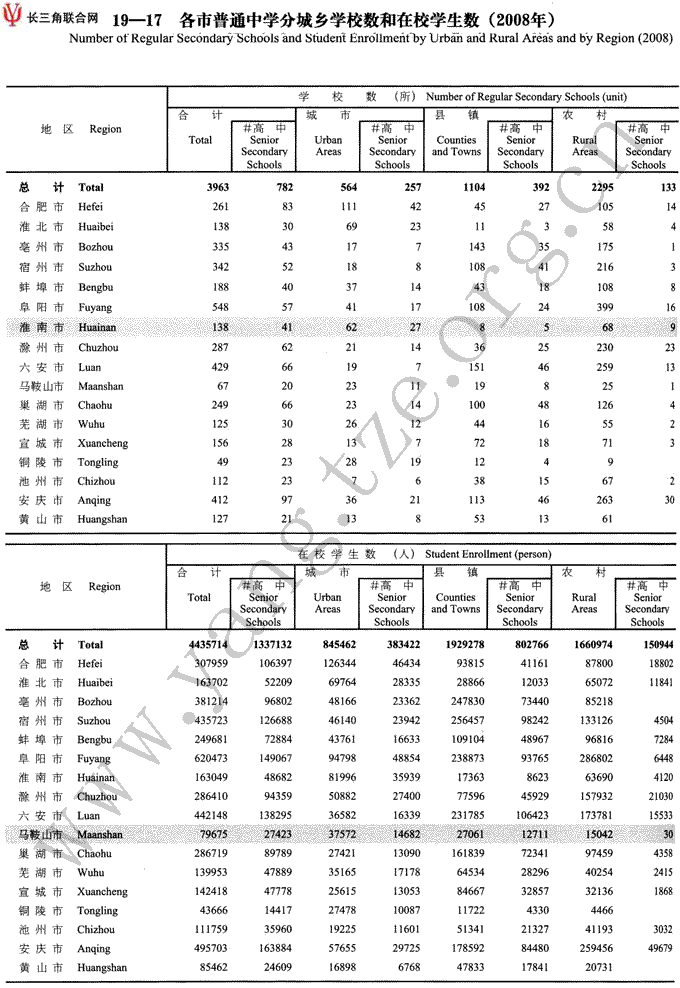 各市普通中学分城乡学校数和在校学生数(2008年)