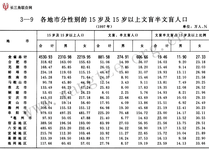 各地市分性别的15岁及15岁以上文盲半文盲人口(1997年)