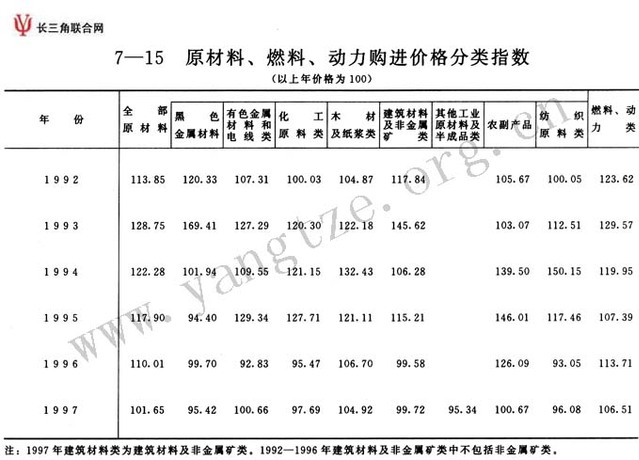 原材料、燃料、动力购进价格分类指数(以上年价格为100)