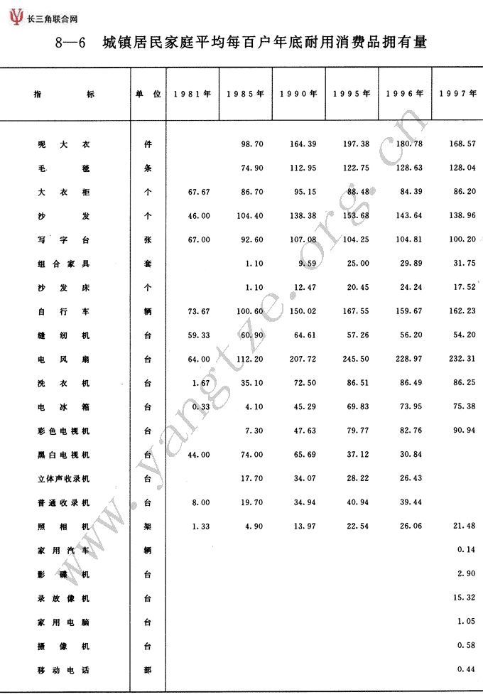 城镇居民家庭平均每百户年底耐用消费品拥有量