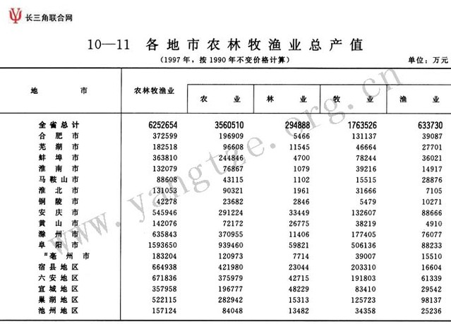 各地市农林牧渔业总产值(1997年,按1990年不变价格计算)