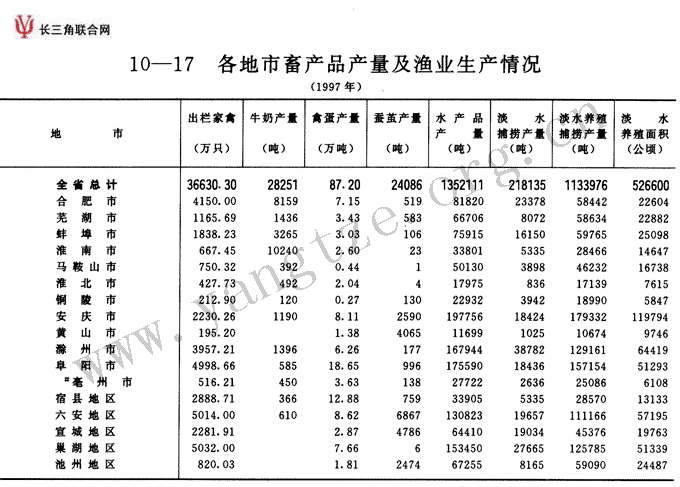 各地市畜产品产量及渔业生产情况(1997年)