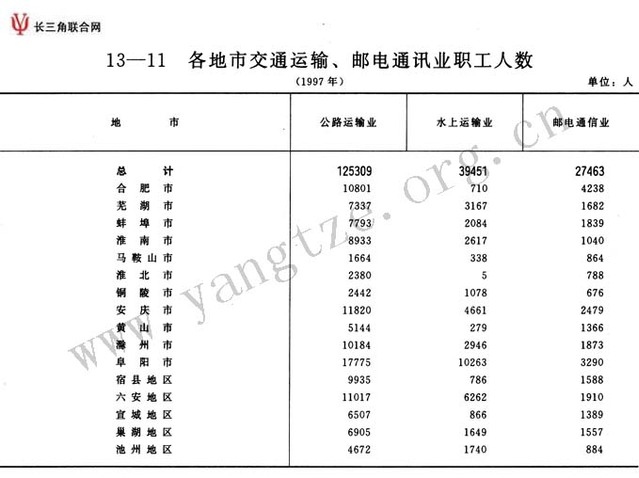 各地市交通运输、邮电通讯业职工人数(1997年)