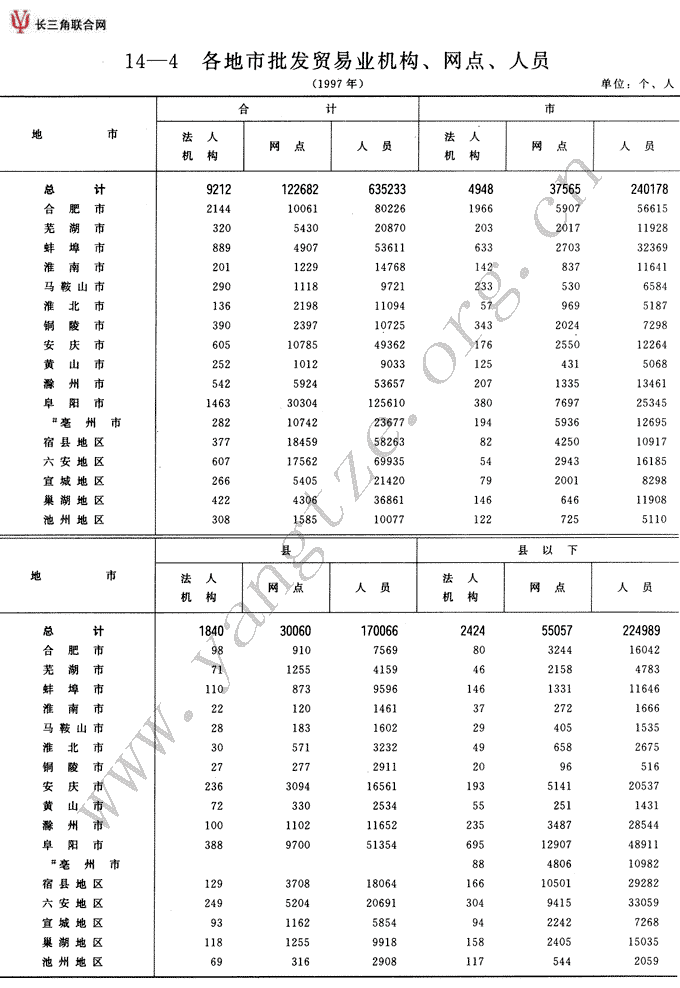 各地市批发贸易业机构、网点、人员(1997年)