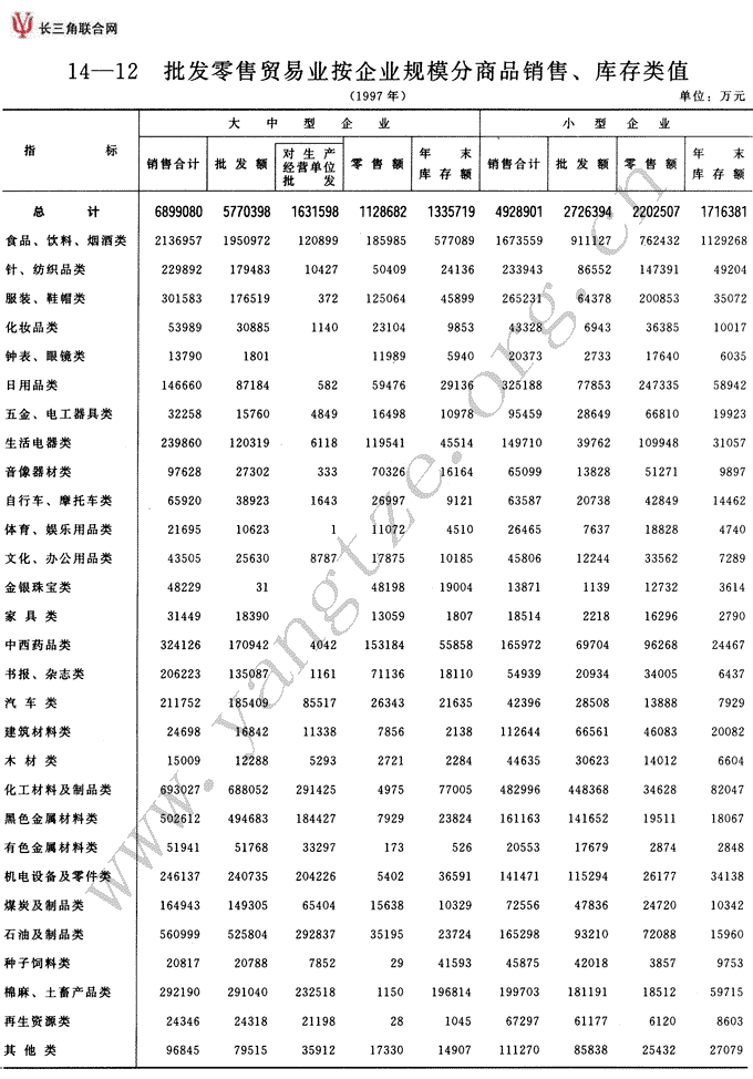 批发零售贸易业按企业规模分商品销售、库存类值(1997年)