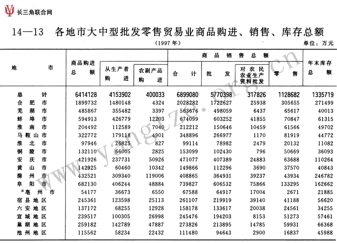 各地市大中型批发零售贸易业商品购进、销售、库存总额(1997年)