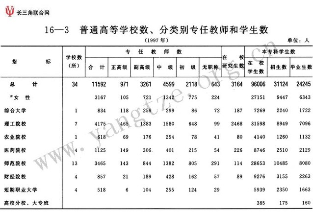 普通高等学校数、分类别专任教师和学生数(1997年)