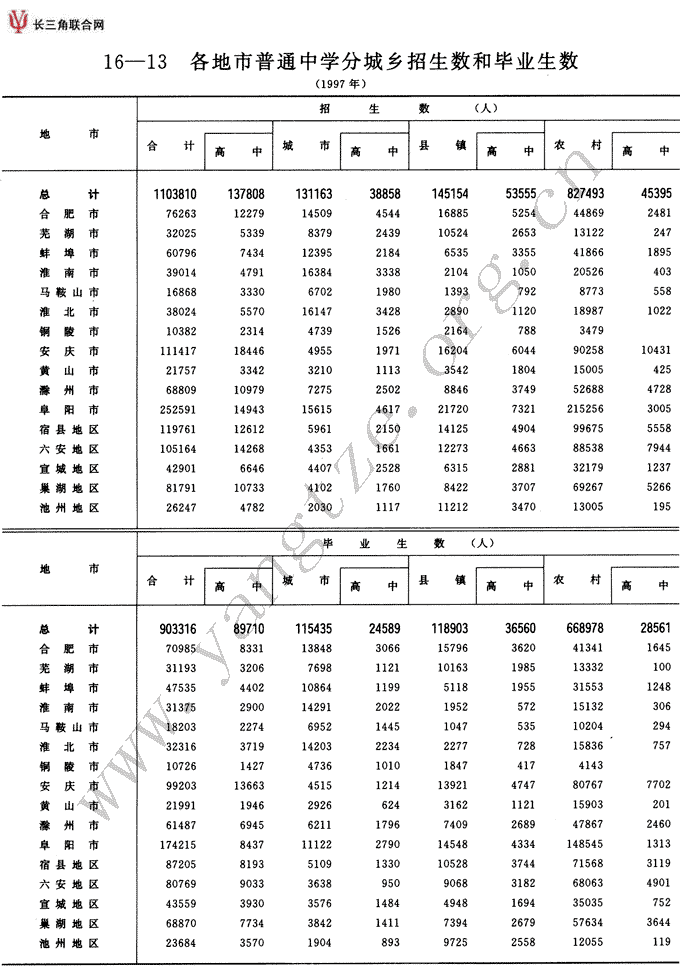 各地市普通中学分城乡招生数和毕业生数(1997年)