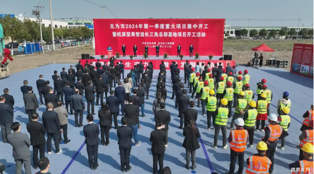 ——3月22日上午,无为市2024年第一季度重大项目集中开工暨杭派坚果智造长三角总部基地项目开工活动举行。此次集中开工的重大项目共有22个,总投资127.19亿元,涉及新材料、电线电缆、羽毛羽绒、绿色食品、高端装备制造、新能源和智能网联汽车、先进光伏和新型储能等多个领域。