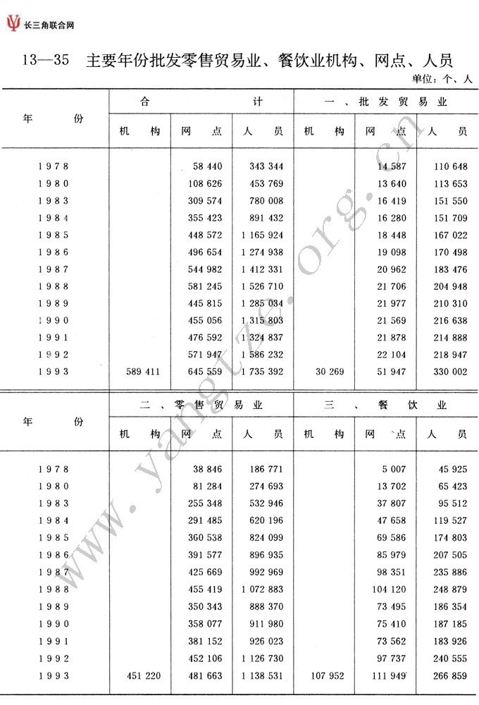 主要年份批发零售贸易业、餐饮业机构、网点、人员