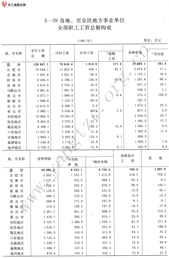 各地、市全民地方事业单位全部职工工资总额构成情况