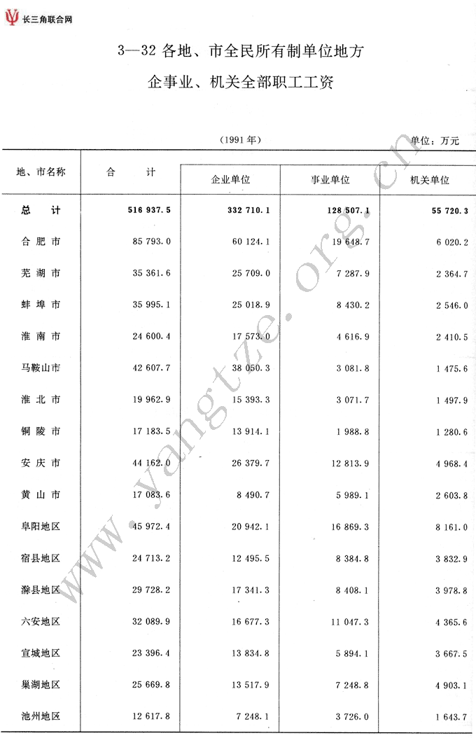 各地、市全民所有制单位地方企事业、机关全部职工工资