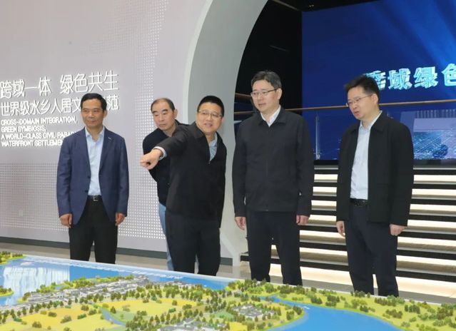 随后,金晓明一行来到长三角生态绿色一体化发展示范区规划展示馆。在展示馆内,金晓明仔细观看示范区的发展规划模型,听取示范区建设背景、目标定位以及未来发展方向的介绍,并详细询问区域规划、重点项目、基础设施建设和生态环境保护等相关情况。金晓明指出,长三角生态绿色一体化发展示范区是推动区域协同发展的重要平台,青浦区在生态保护、绿色发展、科技和产业协同创新等方面与长三角生态一体化发展要求高度契合。要加强规划引领,优化资源配置,用好这个“先手棋”和“突破口”,争取在“一体化”趋势和“高质量”要求中实现更大作为,推动示范区建设不断取得新成效。