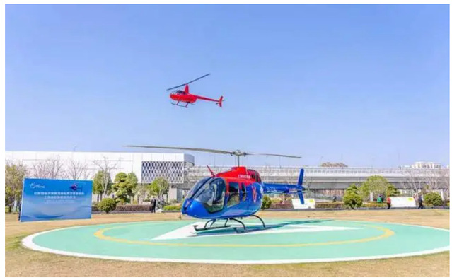 3月18日,新辰航空的直升机从虹桥商务区启程,飞向虹桥国际开放枢纽的“两带”。(受访对象提供)