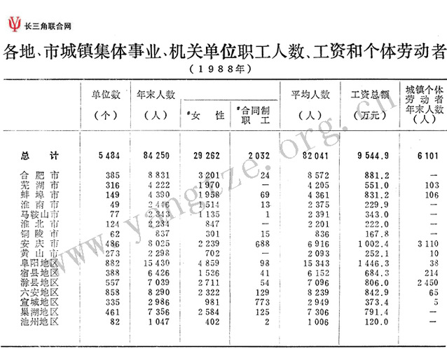 各地、市城镇集体事业、机关单位职工人数、工资和个体劳动者