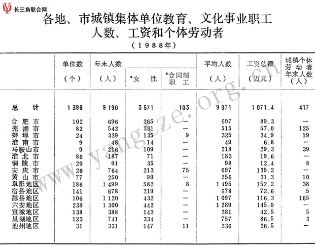 各地、市城镇集体单位教育、文化事业职工人数、工资和个体劳动者