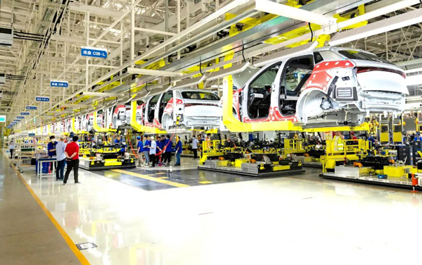 比亚迪汽车常州基地里,自动化生产流水线上一派繁忙景象。(常州市人大常委会供图)